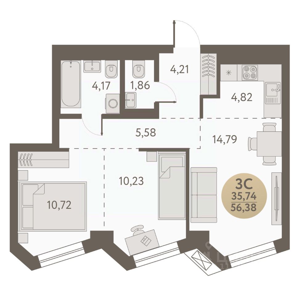 Общая площадь56,38 м²