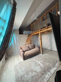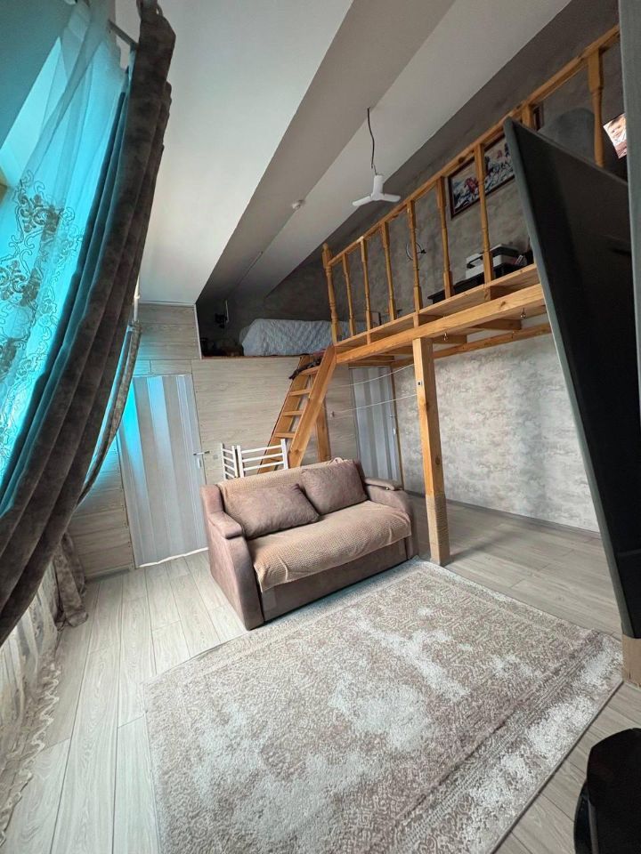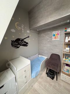 Благодаря высокому потолку и просторной комнате(25.7 кв.м.) удалось рационально использовать каждый квадратный метр и создать функциональное пространство с выделенными зонами: комната + детская+ гардеробная + второй ярус со спальным местом и рабочей зоной.