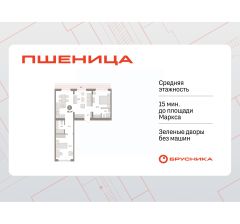 Квартира с кухней-гостиной и двумя спальнями в жилом районе "Пшеница". Особенности планировки: окна на две стороны, вид во двор, разнесённые спальни, предчистовая отделка, мастер-спальня, терраса на крыше.