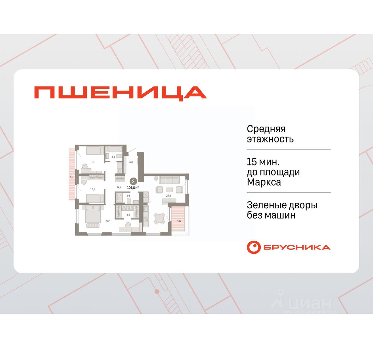 Квартира с кухней-гостиной и тремя спальнями в жилом районе "Пшеница". Особенности планировки: гардеробная, вид во двор, разнесённые спальни, предчистовая отделка, мастер-спальня, балкон, терраса на крыше.