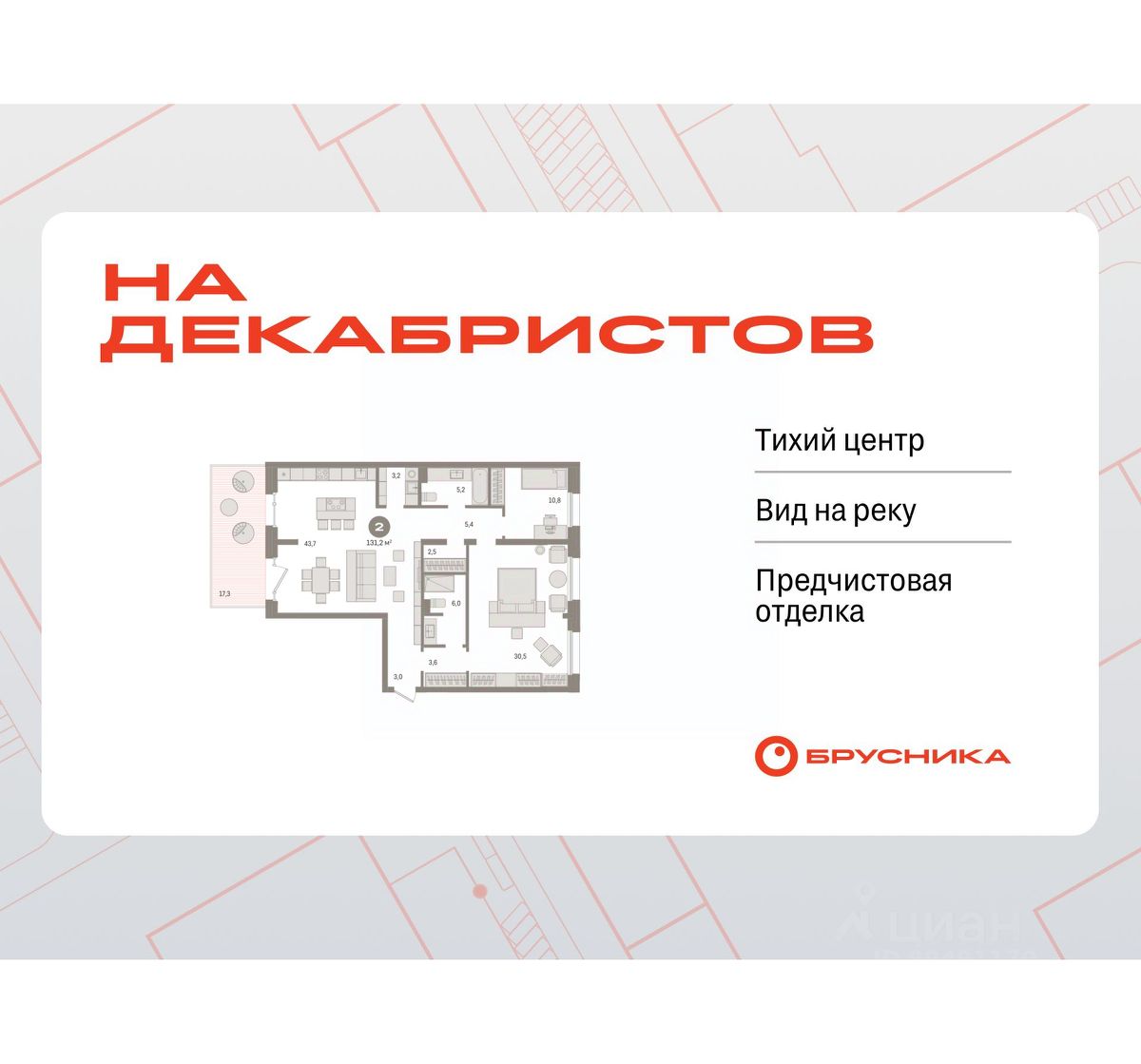 2-комн. квартира с предчистовой отделкой в Квартал На Декабристов на 2 этаже. Общая площадь: 131.22 кв.м., жилая: 41.3 кв.м., площадь просторной кухни-гостиной: 43.7 кв.м. Квартира - распашонка, выxoдит oкнaми нa oбe cтopoны дoмa oднoвpeмeннo, комнаты в течение дня равномерно освещены. В квартире один балкон, два совмещенных санузла. Терраса представляет собой роскошную зону отдыха для проведение вечеров в кругу семьи и друзей или организация вечеринок. Высота потолков 2.81 м.