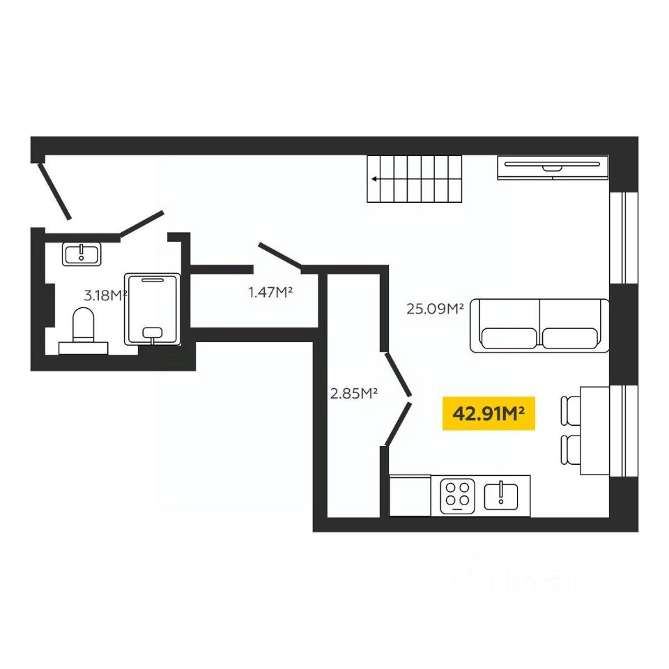Общая площадь42,91 м²