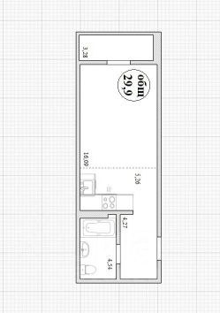 кухню - гостиную благодаря квадратной форме комнаты можно легко зонировать в отдельную кухню и комнату с помощью раздвижных дверей в отдельную кухню (5,26 кв.м.) и жилую комнату (16,09 кв.м.);