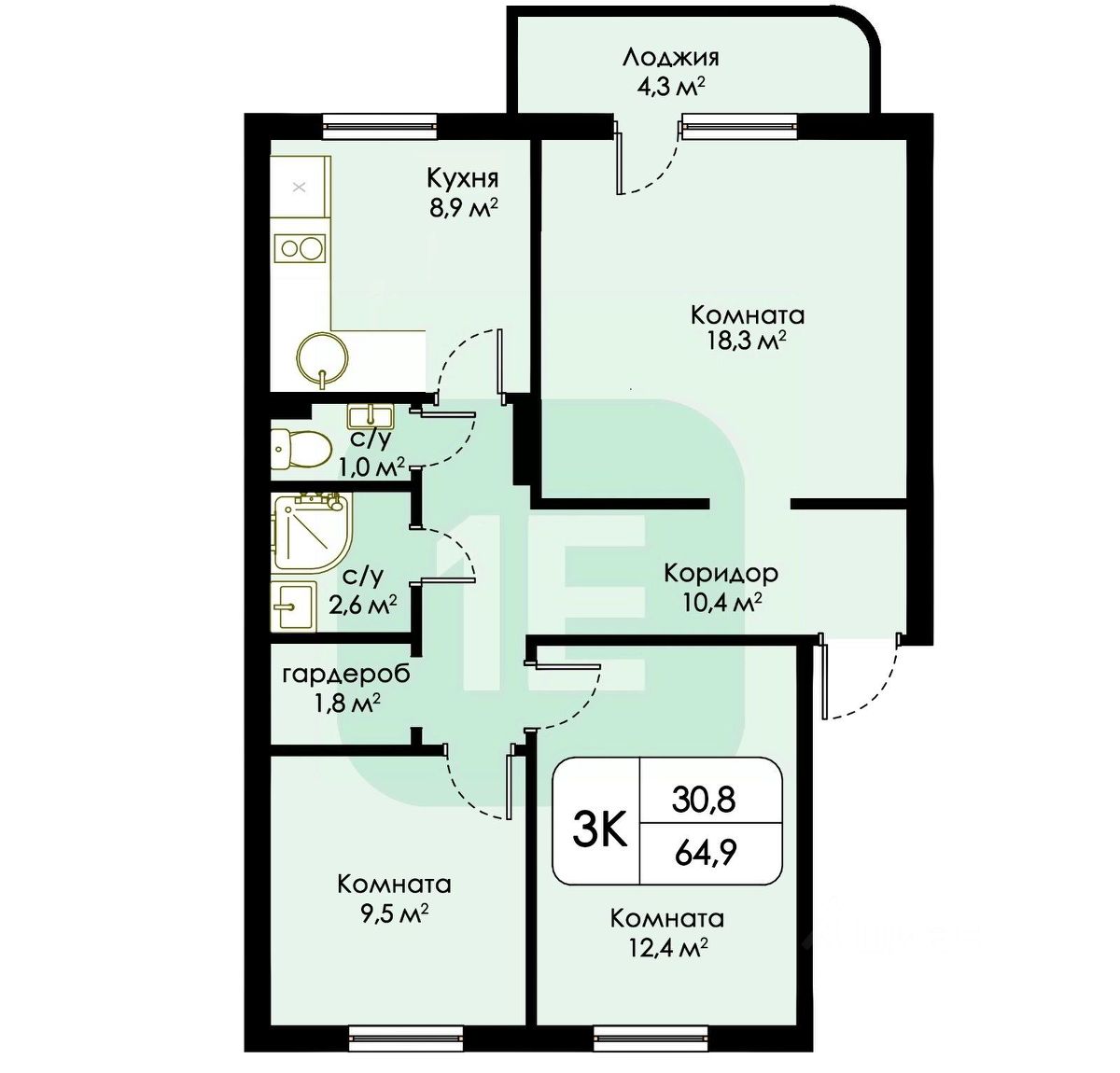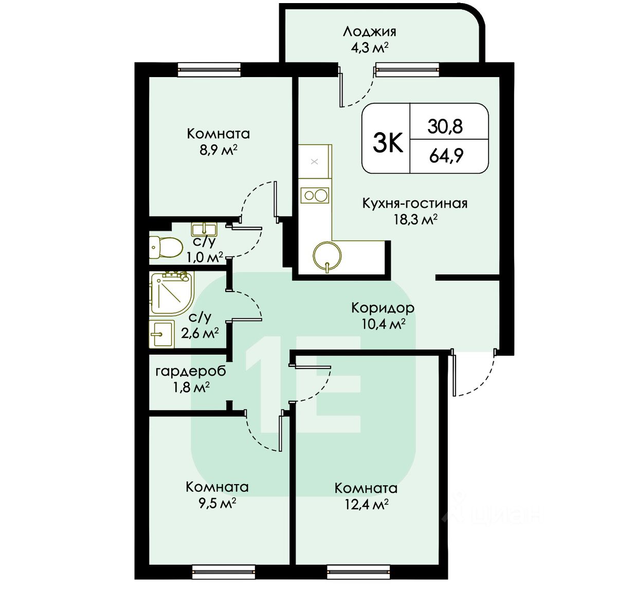 Полноценная трёхкомнатная квартира с улучшенной планировкой.