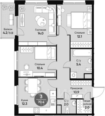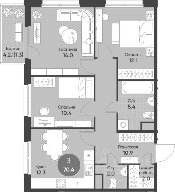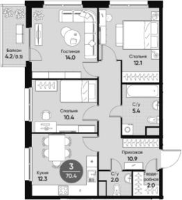 Общая площадь69,1 м²