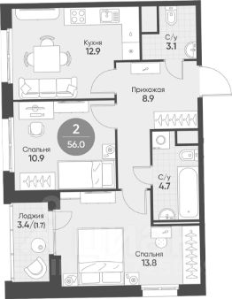 Площадь кухни12,9 м²