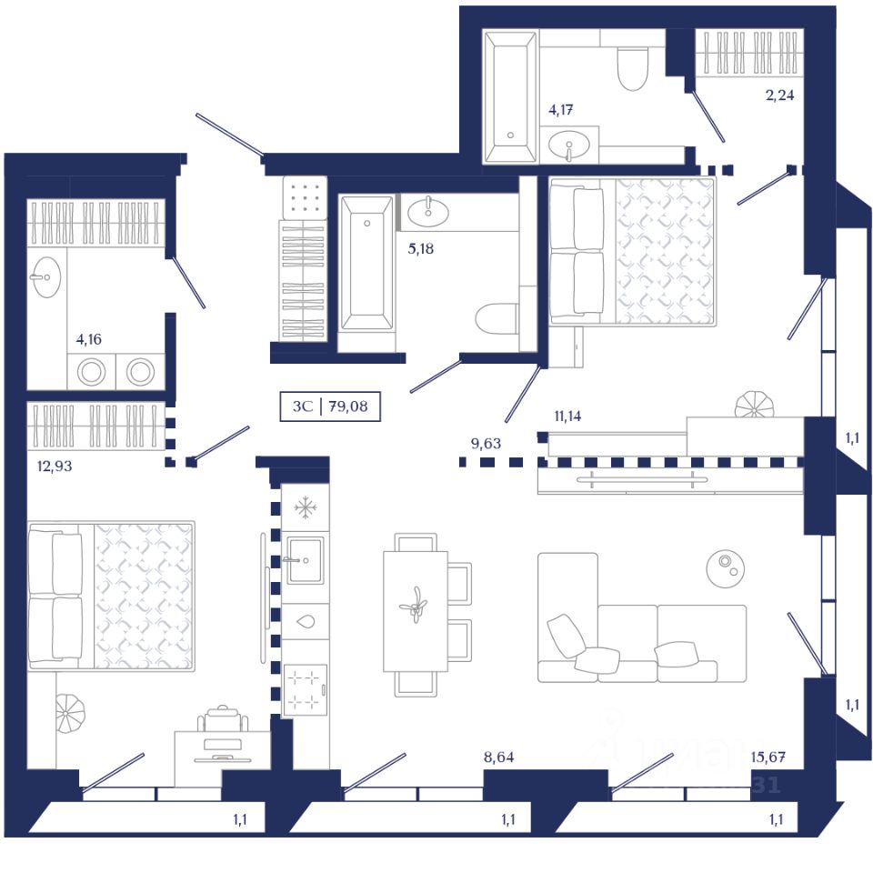 Общая площадь79,08 м²