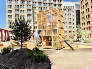 Двор формата Family Space: игровые площадки для детей всех возрастов, тренажёрные площадки, скалодром, беговая дорожка и пространство для йоги.