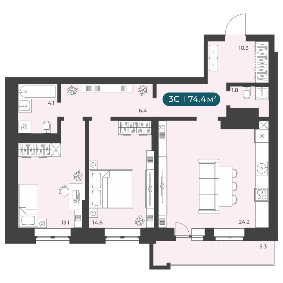 Общая площадь74,4 м²