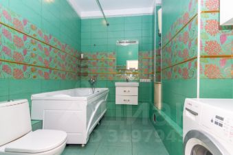 Ванная комната очень большая. Имеет ниши для размещения навесных шкафов, стиральной машины, корзины для белья. Все встроено и продумано. Стены полностью до самого потолка покрыты кафелем хорошего качества известного бренда.