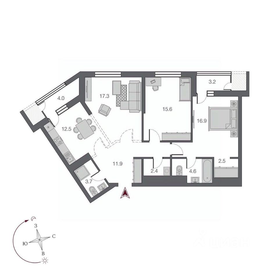 Продаётся 3-комнатная квартира в строящемся доме (БС 1,2 - 2 этап), срок сдачи: IV-кв. 2025, общей площадью 94.6 кв.м., на 19 этаже. Квартал открытий Беринг", с любовью созданный группой компаний Новый мир", состоит из четырех зданий переменной этажности и расположен на первой береговой линии реки Обь в старом центре Новосибирска.