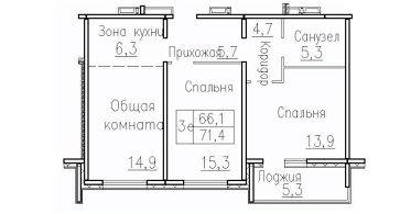 Продаётся 3-комнатная квартира в сданном доме (Фламинго, 20 (поз. 5)), срок сдачи: II-кв. 2019, общей площадью 71.4 кв.м., на 1 этаже. Расположение, транспортная доступность