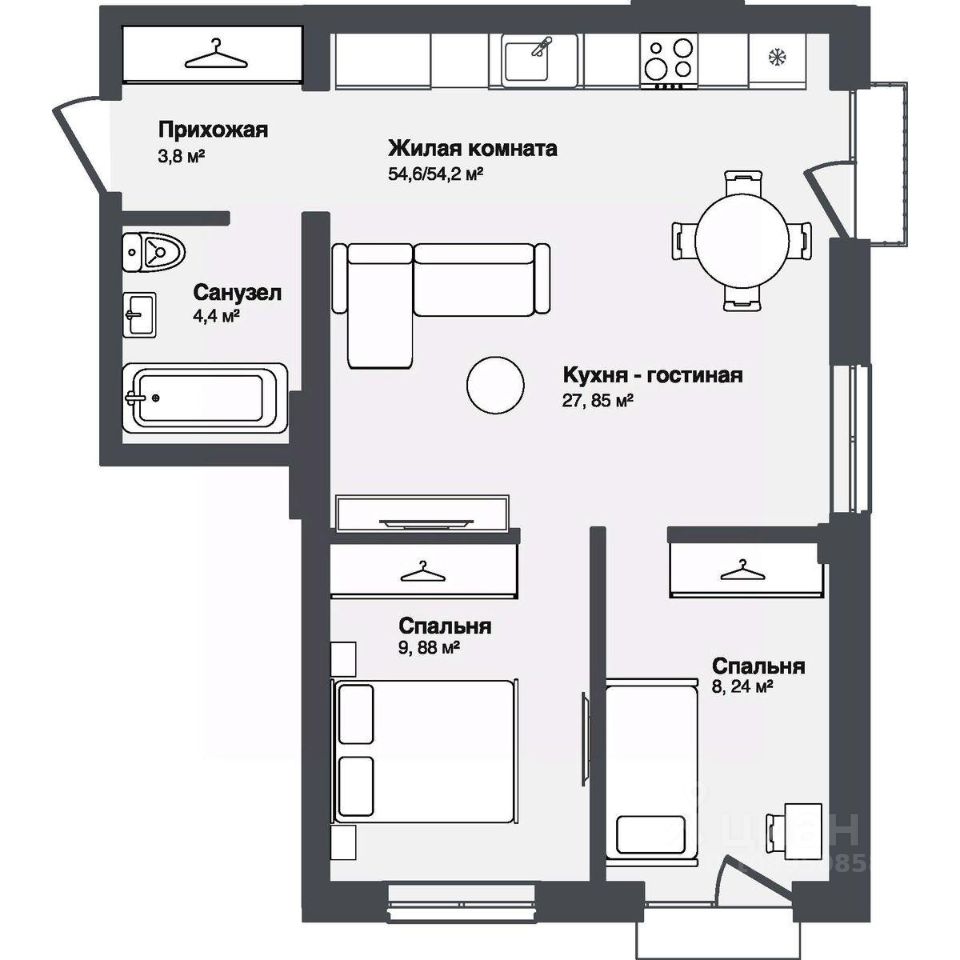 Общая площадь54,56 м²