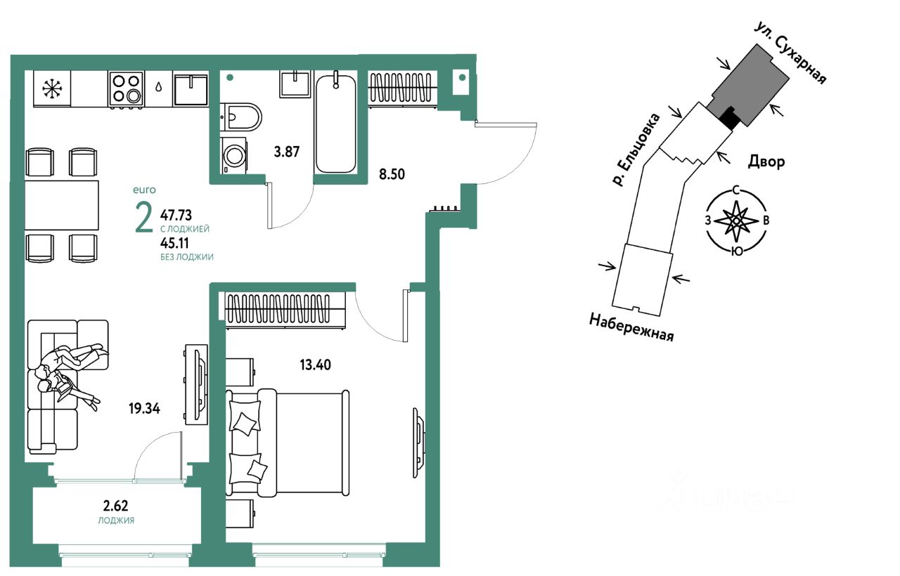 Продается 2комнатная квартира на 23 этаже от застройщика Страна Девелопмент. Площадь квартиры 47,73 кв. м.