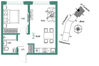 Продается 2комнатная квартира на 28 этаже от застройщика Страна Девелопмент. Площадь квартиры 38,68 кв. м.