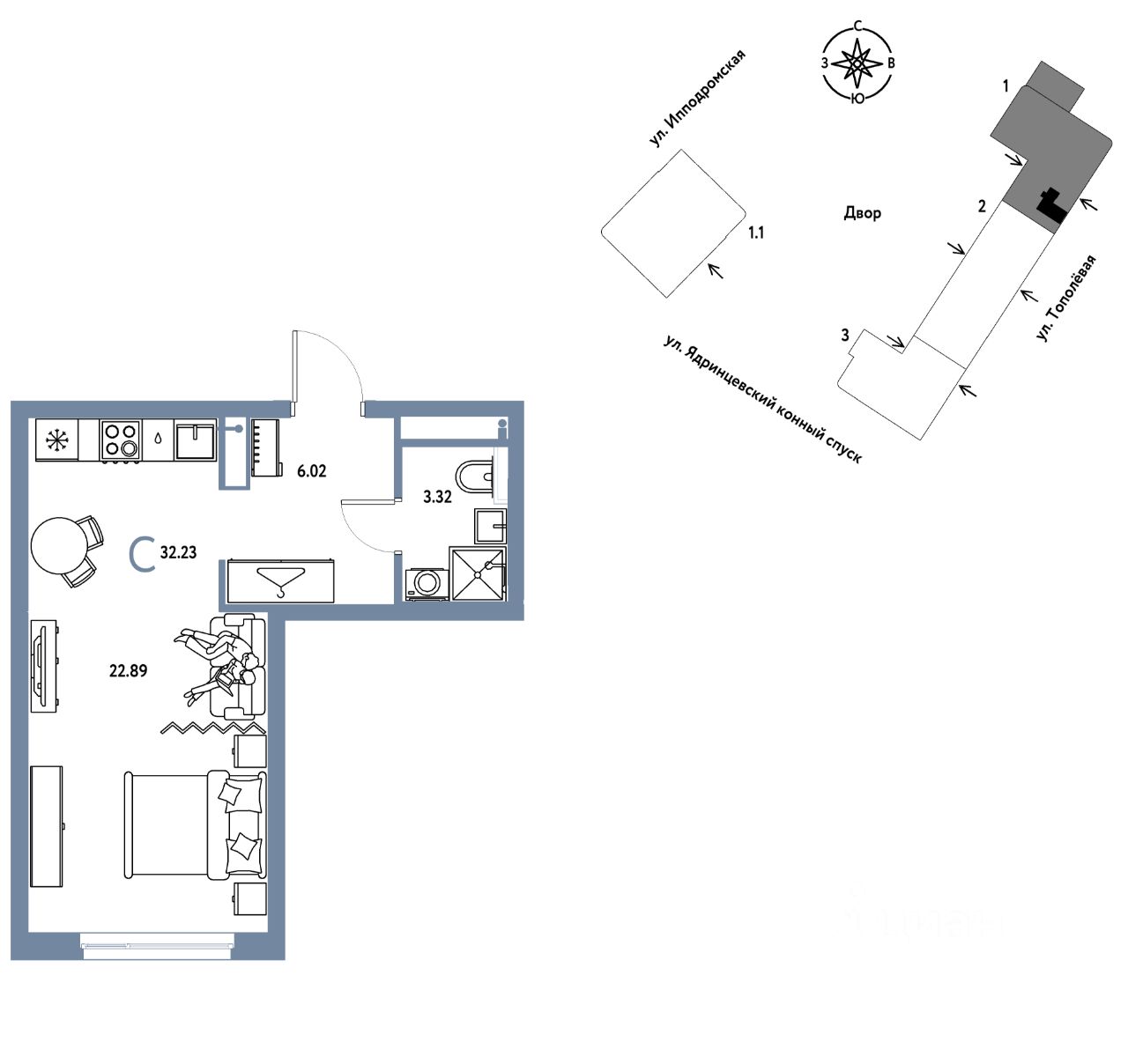 Продается 0комнатная квартира на 9 этаже от застройщика Страна Девелопмент. Площадь квартиры 32,23 кв. м.