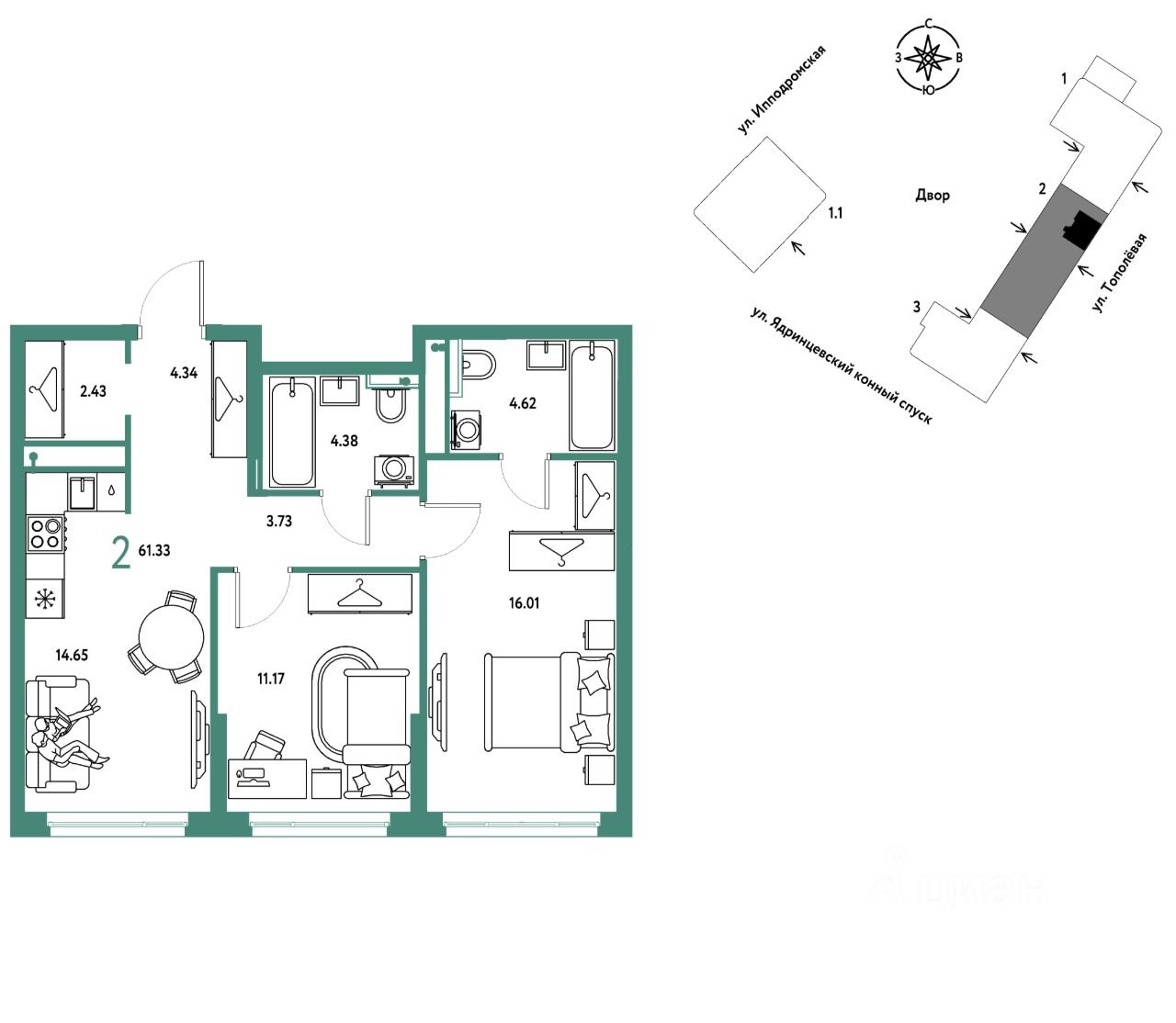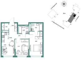 Продается 2комнатная квартира на 8 этаже от застройщика Страна Девелопмент. Площадь квартиры 61,33 кв. м.