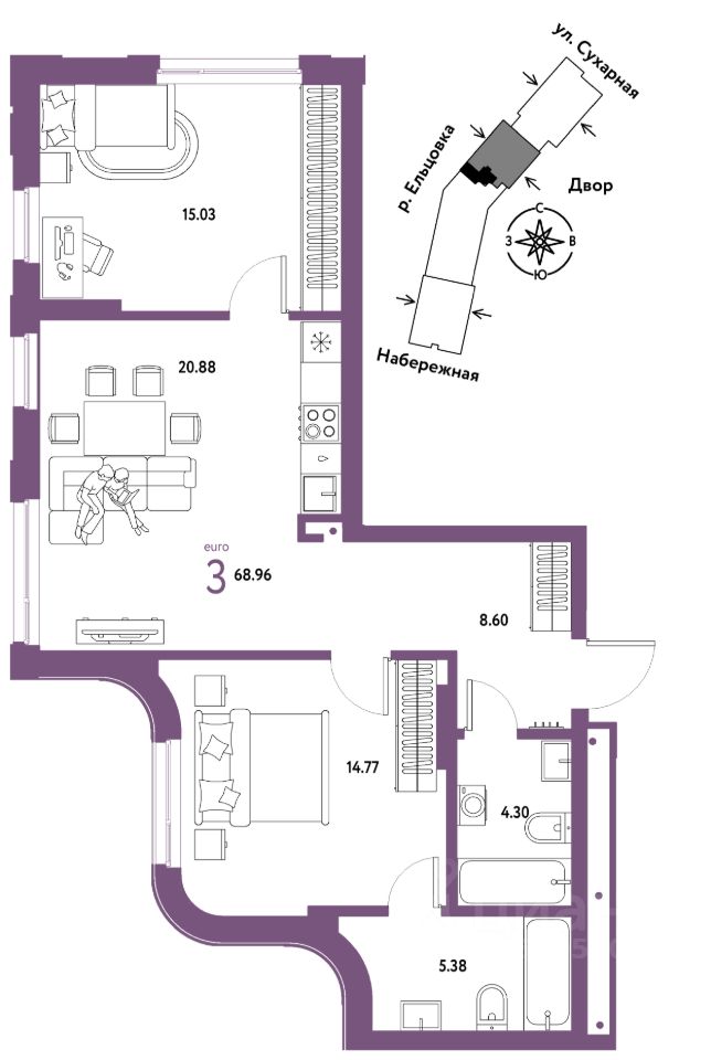 Продается 3комнатная квартира на 5 этаже от застройщика Страна Девелопмент. Площадь квартиры 68,96 кв. м.