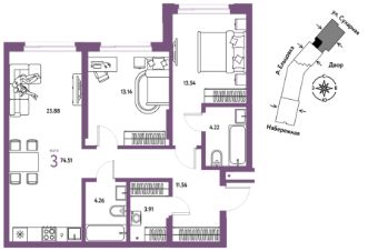 Продается 3комнатная квартира на 18 этаже от застройщика Страна Девелопмент. Площадь квартиры 74,51 кв. м.