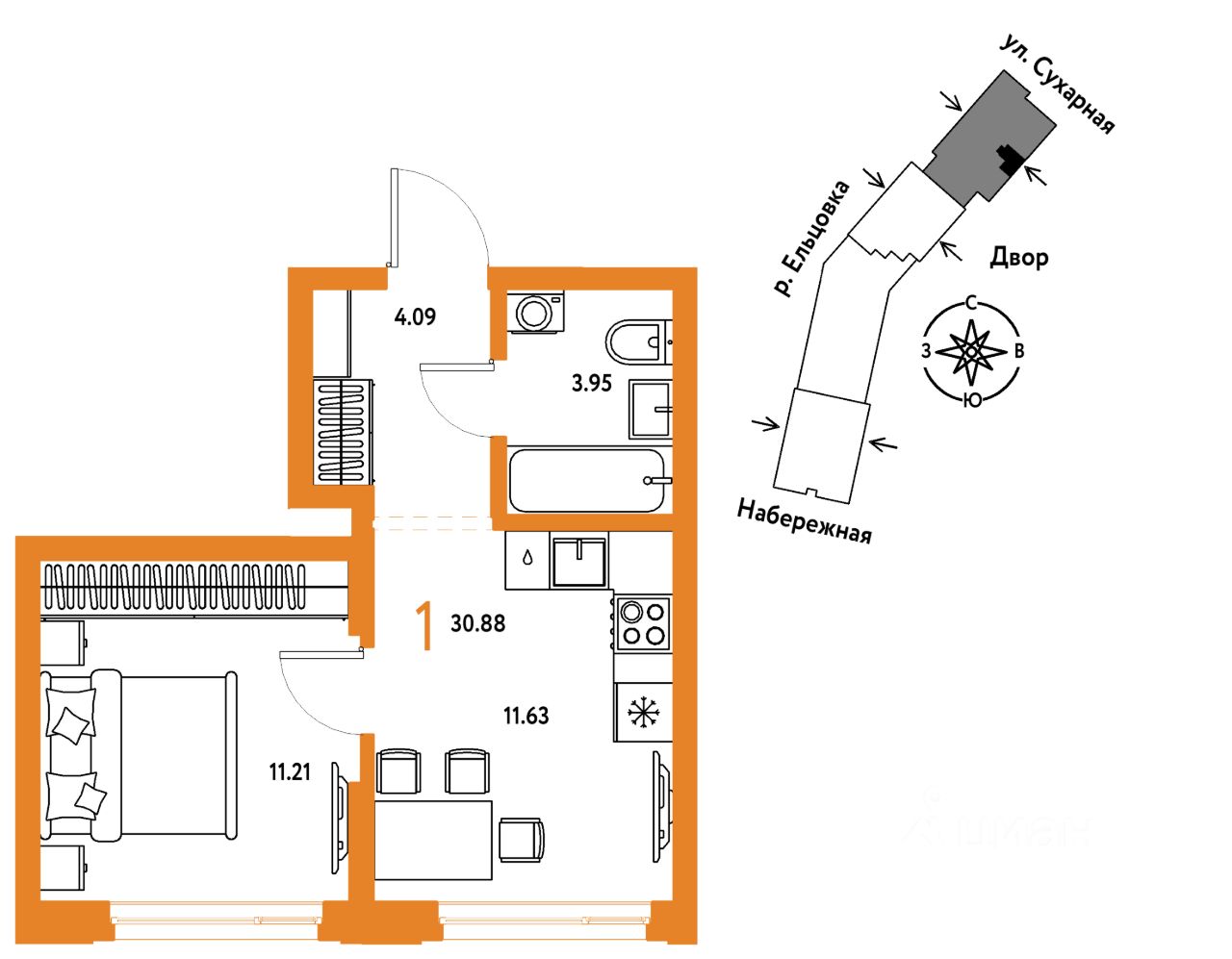 Продается 1комнатная квартира на 22 этаже от застройщика Страна Девелопмент. Площадь квартиры 30,88 кв. м.