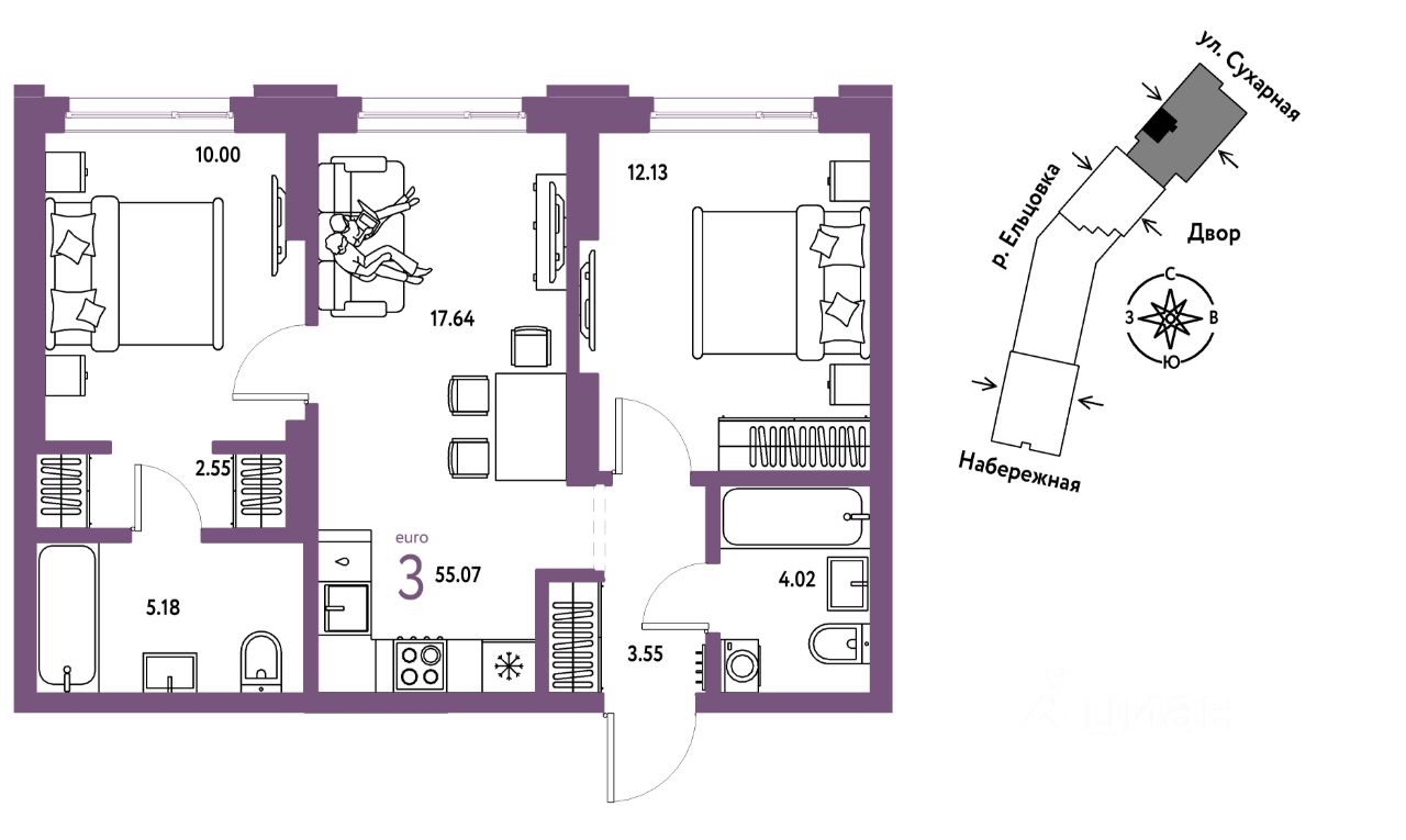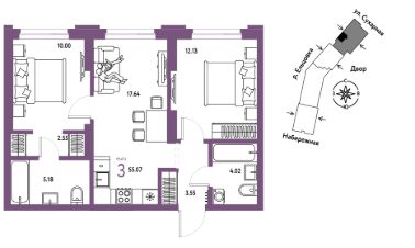 Продается 3комнатная квартира на 2 этаже от застройщика Страна Девелопмент. Площадь квартиры 55,07 кв. м.