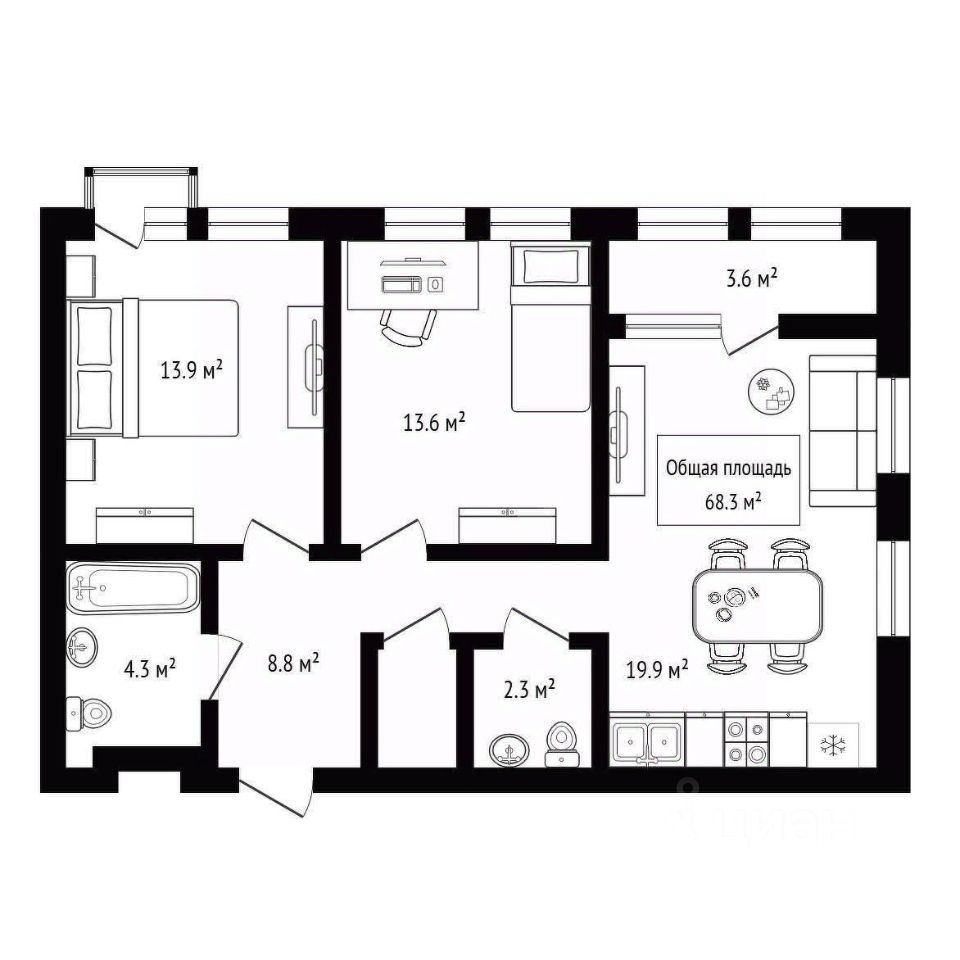 Продуманная планировка идеально подходит для семьи или молодой пары: просторная кухня-гостиная 19,9 м2  сердце дома, где приятно проводить время с близкими, и две уютные спальни 13,6 и 13,9 м2, где каждый сможет найти свой уголок, раздельный санузел и гардеробная и теплая лоджия.
