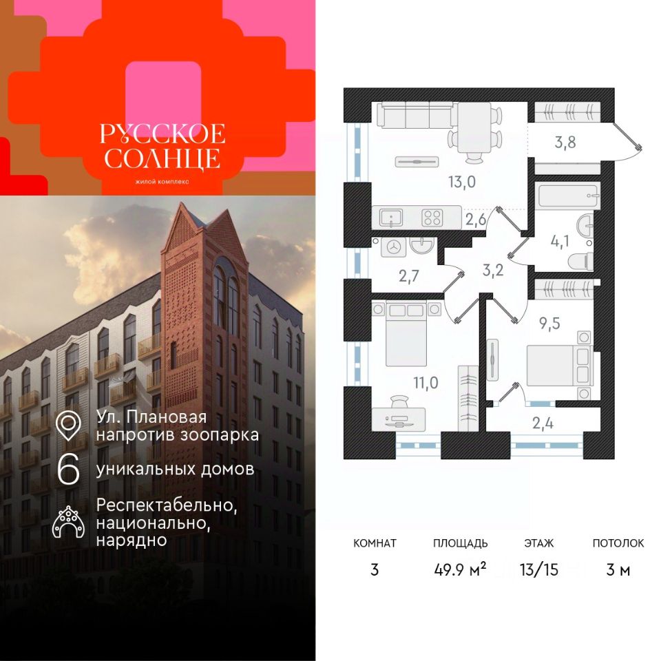 3-комн. студия с предчистовой отделкой в ЖК "Русское солнце" на 13 этаже. Общая площадь: 49.9 кв.м., жилая: 33.5 кв.м., общая площадь гостиной-столовой с кухонной зоной: 15.6 кв.м. Квартира угловая, окна oбecпeчивaют paвнoмepнoe ocвeщeниe в тeчeниe дня. В квартире одна лоджия, один совмещенный и один раздельный санузел. Высота потолков 3 м.