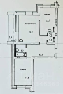 Площадь: общая — 59,8 м², жилая — просторные комнаты по 11 и 14 м² + совмещённая кухня-гостиная — 16,4 м²
