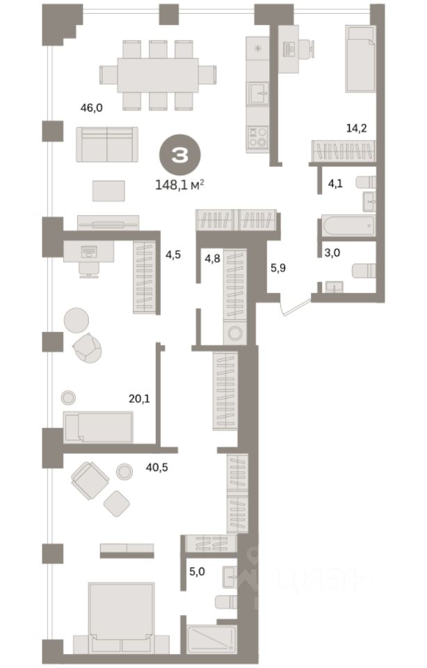 Квартира с кухней-гостиной и тремя спальнями в квартале "На Декабристов". Особенности планировки: окна на две стороны, второй санузел, предчистовая отделка, мастер-спальня, постирочная.