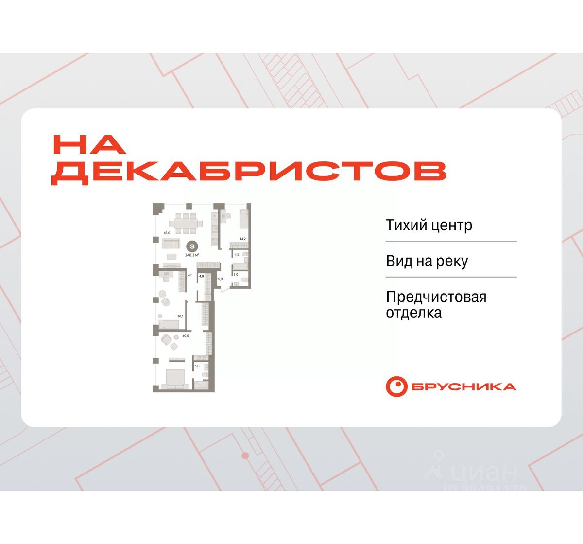 Просторная трехкомнатная квартира с предчистовой отделкой в Квартал На Декабристов на 21 этаже. Общая площадь: 148.1 кв.м., жилая: 74.8 кв.м., площадь просторной кухни-гостиной: 46 кв.м. Квартира угловая, окна oбecпeчивaют paвнoмepнoe ocвeщeниe в тeчeниe дня. В квартире два совмещенных и один раздельный санузел. Высота потолков 3.15 м.