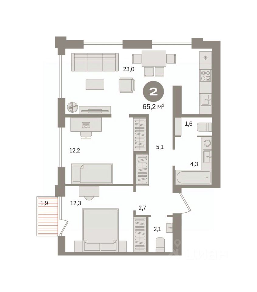 Квартира с кухней-гостиной и двумя спальнями в жилом районе "Пшеница". Особенности планировки: второй санузел, вид во двор, разнесённые спальни, предчистовая отделка, балкон.