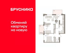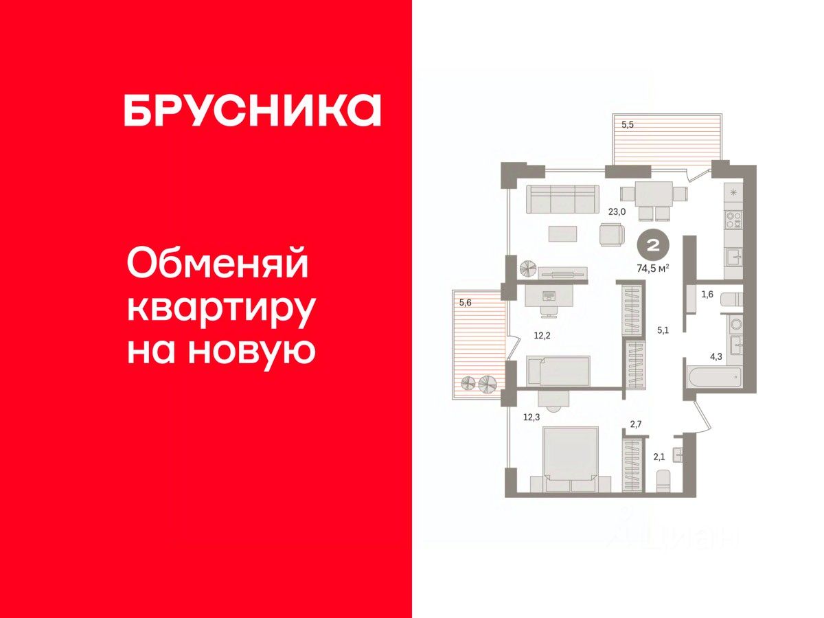 Квартира с кухней-гостиной и двумя спальнями в жилом районе "Пшеница". Особенности планировки: балкон, вид во двор, второй санузел, предчистовая отделка, разнесённые спальни.
