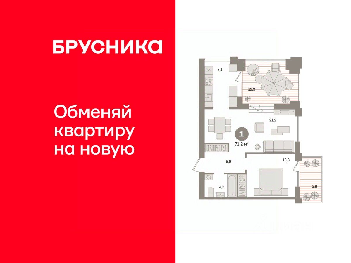 Квартира с кухней-гостиной и одной спальней в жилом районе "Пшеница". Особенности планировки: балкон, предчистовая отделка, терраса на крыше.