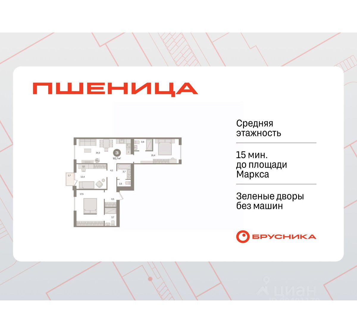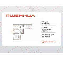 Квартира с кухней-гостиной и тремя спальнями в жилом районе "Пшеница". Особенности планировки: второй санузел, гардеробная, вид во двор, разнесённые спальни, предчистовая отделка, мастер-спальня, балкон.