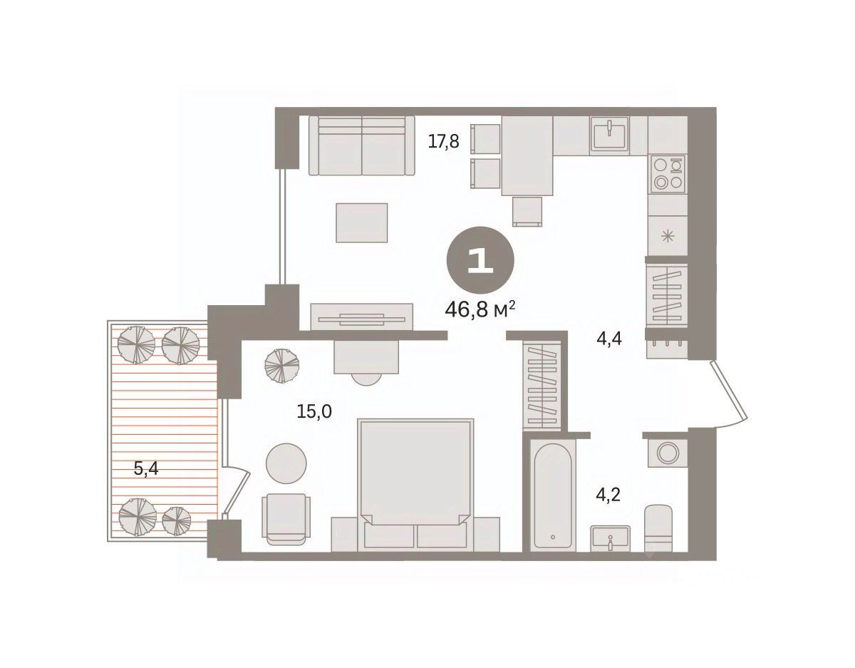 Однокомнатная квартира с предчистовой отделкой в ЖК "Пшеница" на 5 этаже. Общая площадь: 46.81 кв.м., жилая: 15 кв.м., площадь просторной кухни-гостиной: 17.8 кв.м. Все окна выходят на одну сторону. В квартире один балкон, один совмещенный санузел. Высота потолков 2.7 м.