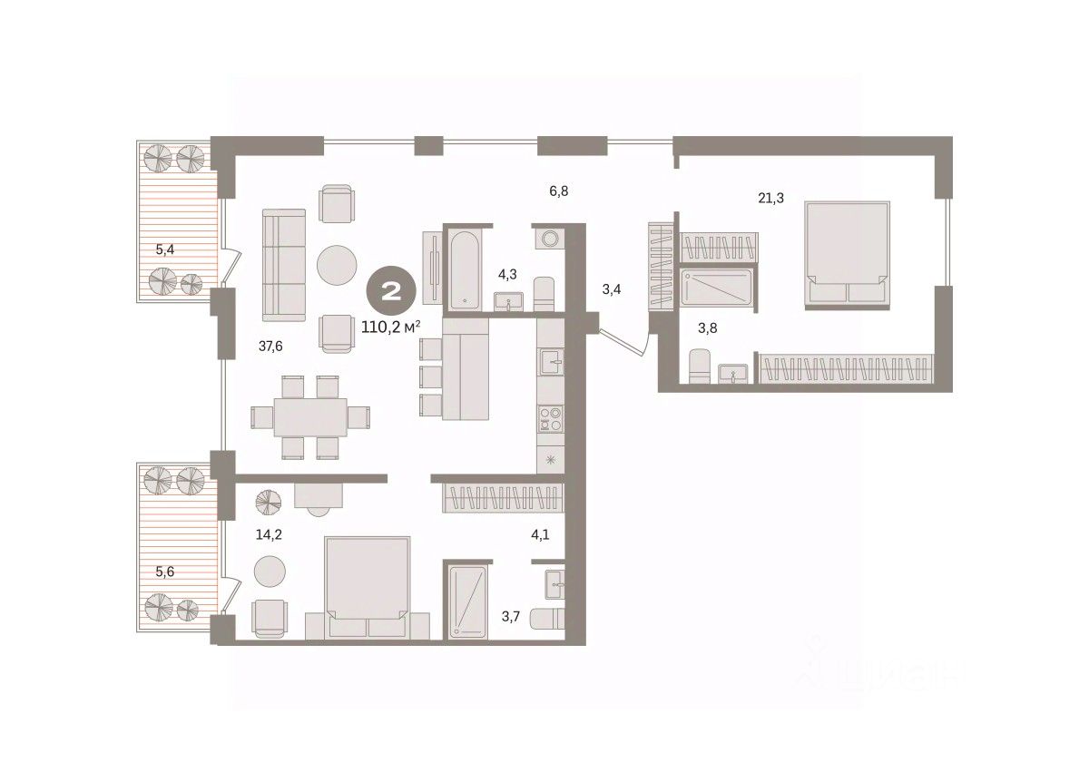 Двухкомнатная квартира с предчистовой отделкой в ЖК "Пшеница" на 8 этаже. Общая площадь: 110.18 кв.м. Высота потолков 2.7 м.