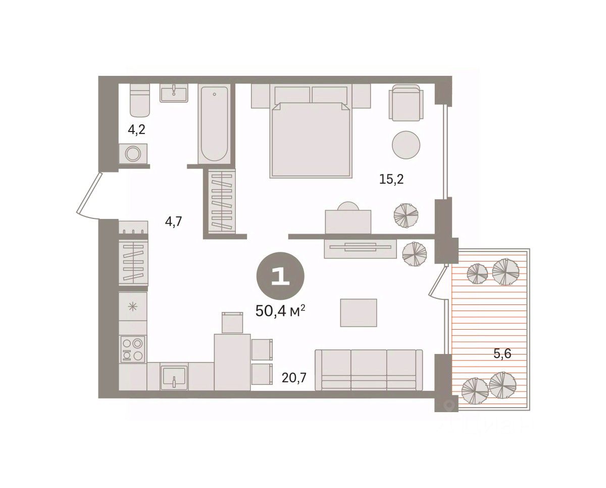 Просторная однокомнатная квартира с предчистовой отделкой в ЖК "Пшеница" на 5 этаже. Общая площадь: 50.38 кв.м., жилая: 15.2 кв.м., площадь просторной кухни-гостиной: 20.7 кв.м. Все окна выходят на одну сторону. В квартире один балкон, один совмещенный санузел. Высота потолков 2.7 м.
