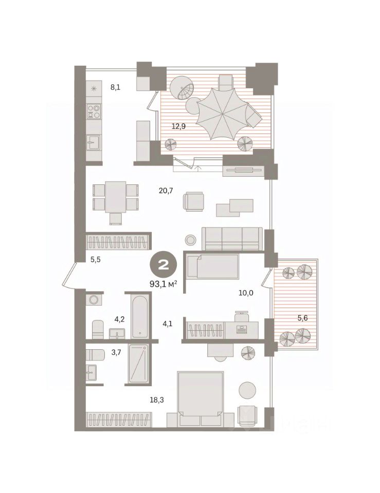 Квартира с кухней-гостиной и двумя спальнями в жилом районе "Пшеница". Особенности планировки: гардеробная, разнесённые спальни, предчистовая отделка, мастер-спальня, балкон, терраса на крыше.