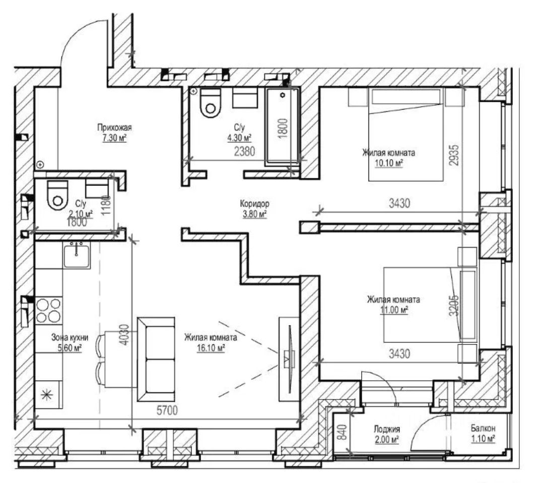 Две спальни и два санузла создают комфорт для всей семьи — здесь удобно жить как молодым парам, так и семьям с детьми.