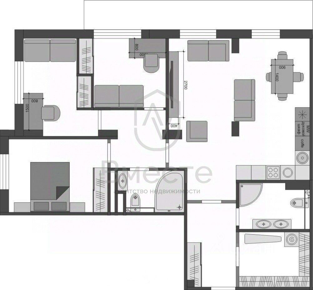 Вся встроенная мебель и техника — холодильник, варочная поверхность, встроенный духовой шкаф, микроволновая печь, посудомоечная машина, встроенная кофе-машина - все концерна Bosch — Siemens. Вся мебель и техника остается и входит в стоимость квартиры.