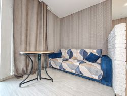 Есть застеклённая лоджия. Оба окна квартиры выходят во двор, прямо на благоустроенную детскую площадку.