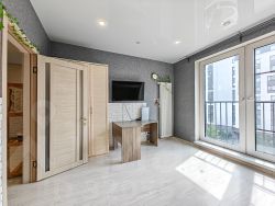 Квартира тёплая и солнечная, с панорамными окнами в пол, через которые в комнаты проникает много естественного света. Благодаря хорошей теплоизоляции отопление практически не используется даже зимой в квартире комфортно.