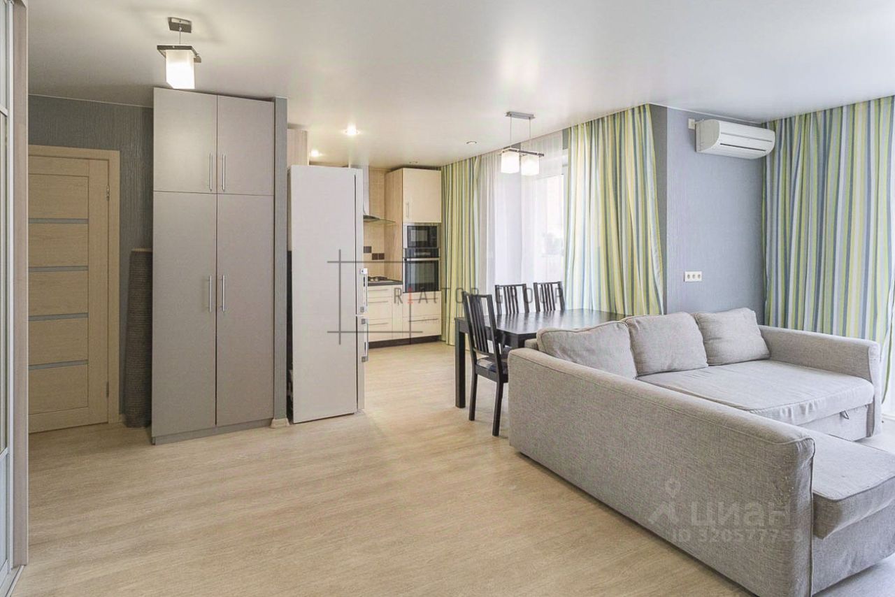 В кухне-гостиной выполнено зонирование кухни, комнаты изолированные. Окна комнат выходят на две стороны. Все окна в пол, поэтому квартира светлая. Застеклённая лоджия. Кухонный гарнитур со встроенной бытовой техникой остаётся (посудомоечная машина, микроволновая печь, духовой шкаф, газовая плита на 5 конфорок, вытяжка). Также остаются встроенные шкафы. Техника и мебель по договорённости. Из техники имеется телевизор, холодильник, стиральная машина, кондиционер.