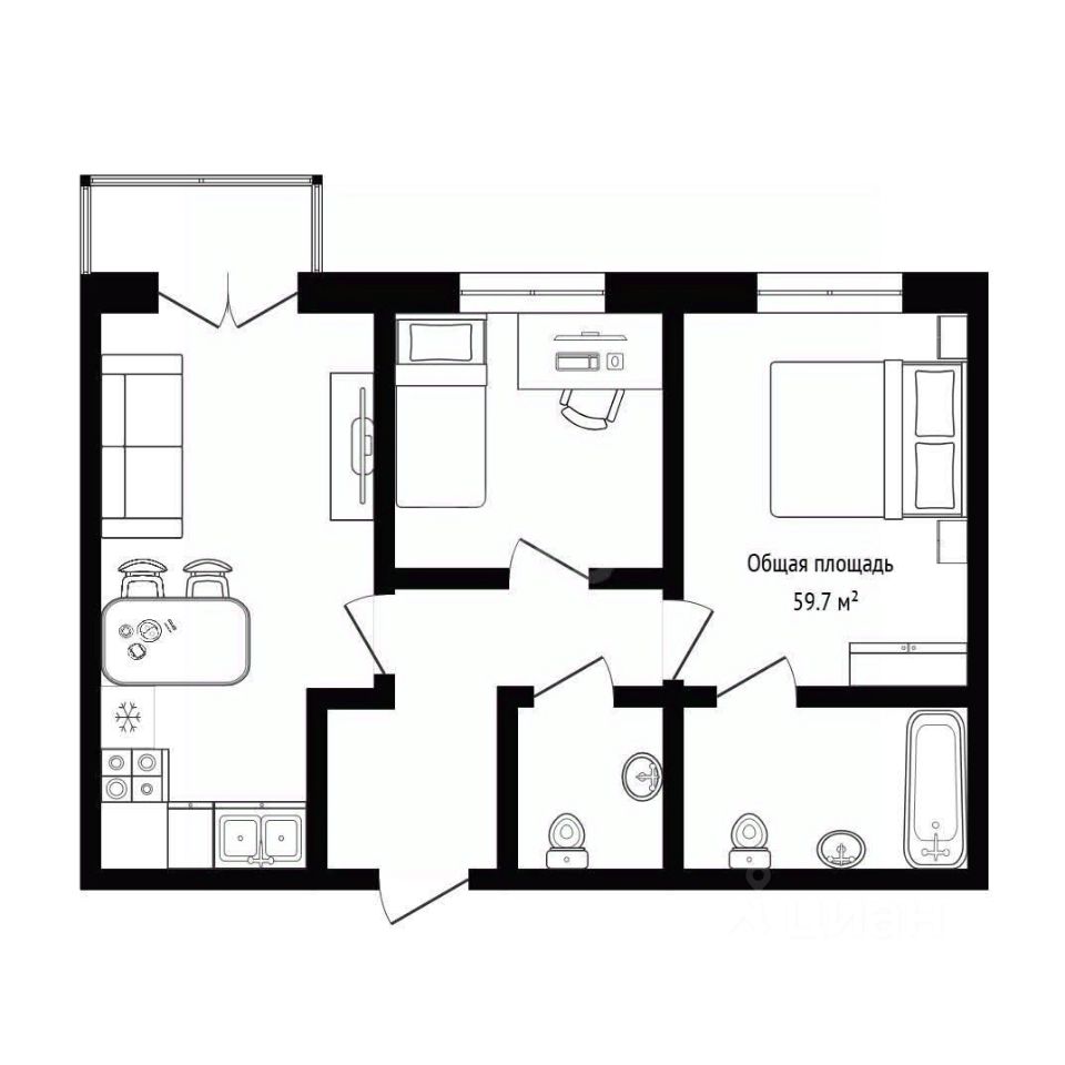 Квартира сдана в состоянии white-box: выполнена стяжка полов с шумо- и гидроизоляцией, выровнены стены, разведены электрика и слаботочные сети. В планировке предусмотрены две раздельные спальни, одна из них мастер-спальня, два санузла и балкон, что повышает функциональность пространства.