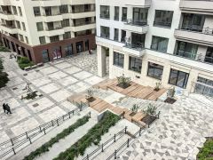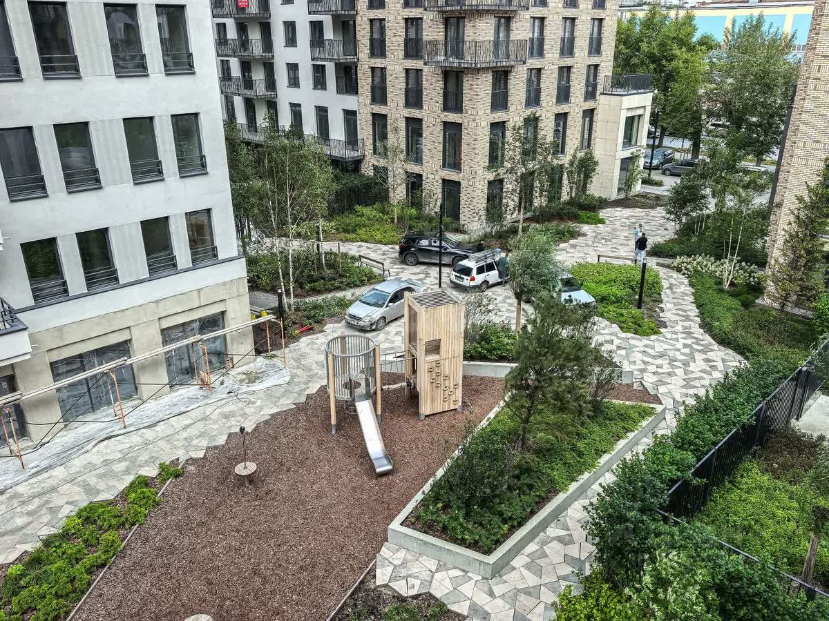 Территория комплекса благоустроена: дворы огорожены, парковки вынесены за их пределы, что исключает хаотичное скопление машин. По периметру установлено видеонаблюдение, а ландшафтное озеленение с ночной подсветкой создает приятную атмосферу для прогулок. Во дворах оборудованы спортивные площадки с тренажерами, велодорожки, зоны для мини-футбола и баскетбола, а также детские игровые площадки с безопасным прорезиненным покрытием.