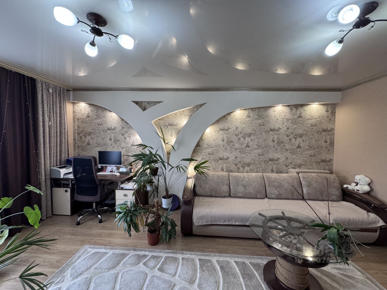 В зале - очень удобный трехметровый диван. По договоренности можем отдельно оставить - письменный стол, журнальный столик, и горку под ТВ зону.