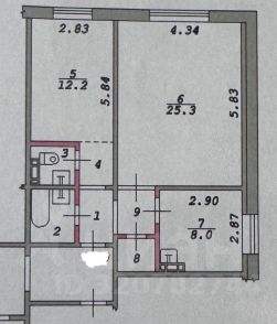 Большой зал 25 кв.м , спальня 12 кв.м и кухня 8 кв.м . Раздельный сан узел с раковиной. А в коридоре просторная гардеробная 1,5 кв.м. Отсечка на 2 квартиры.