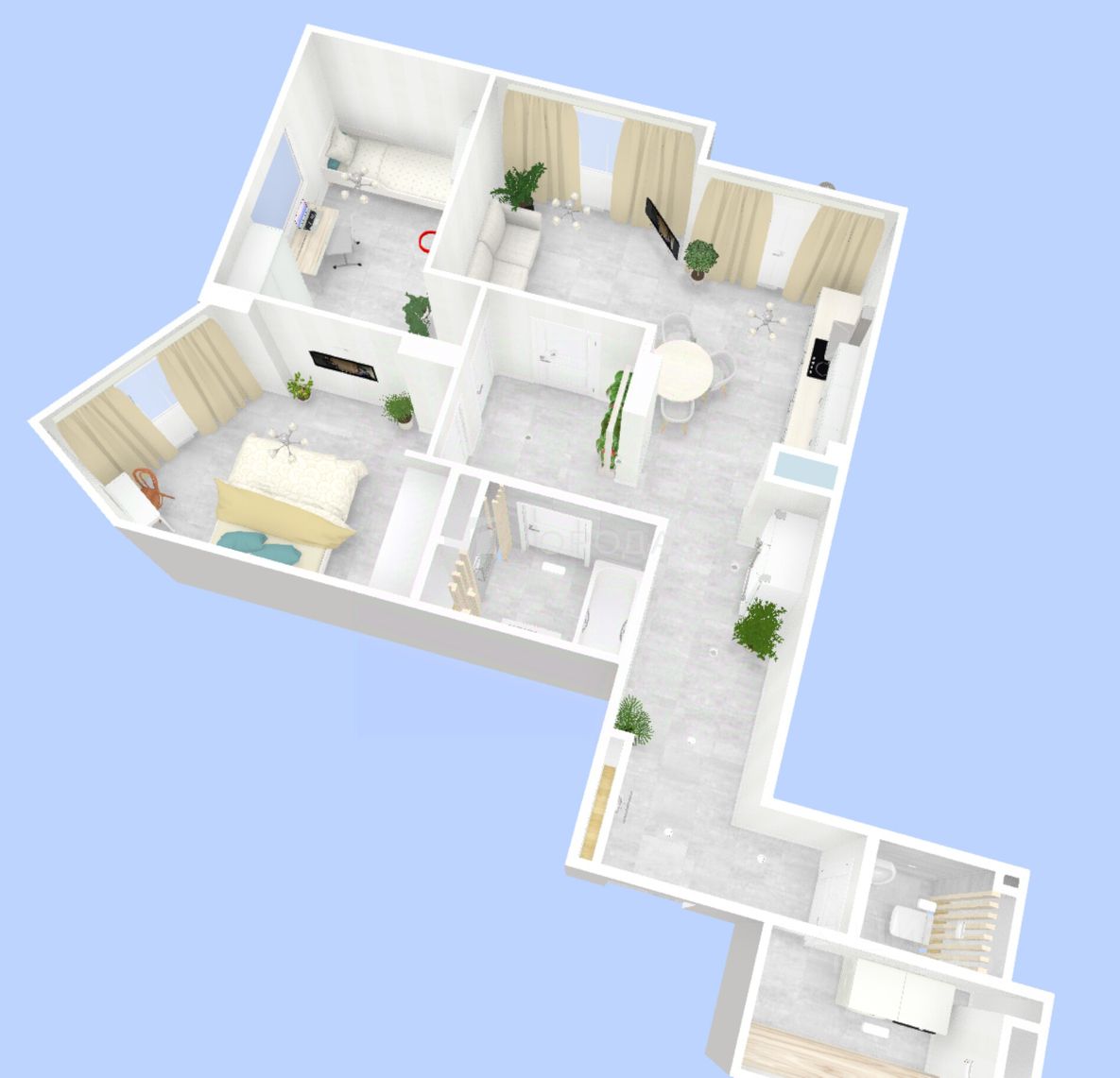 - Планировка: три изолированные комнаты, удобная планировка. Можно сделать 3 студию по желанию клиента.