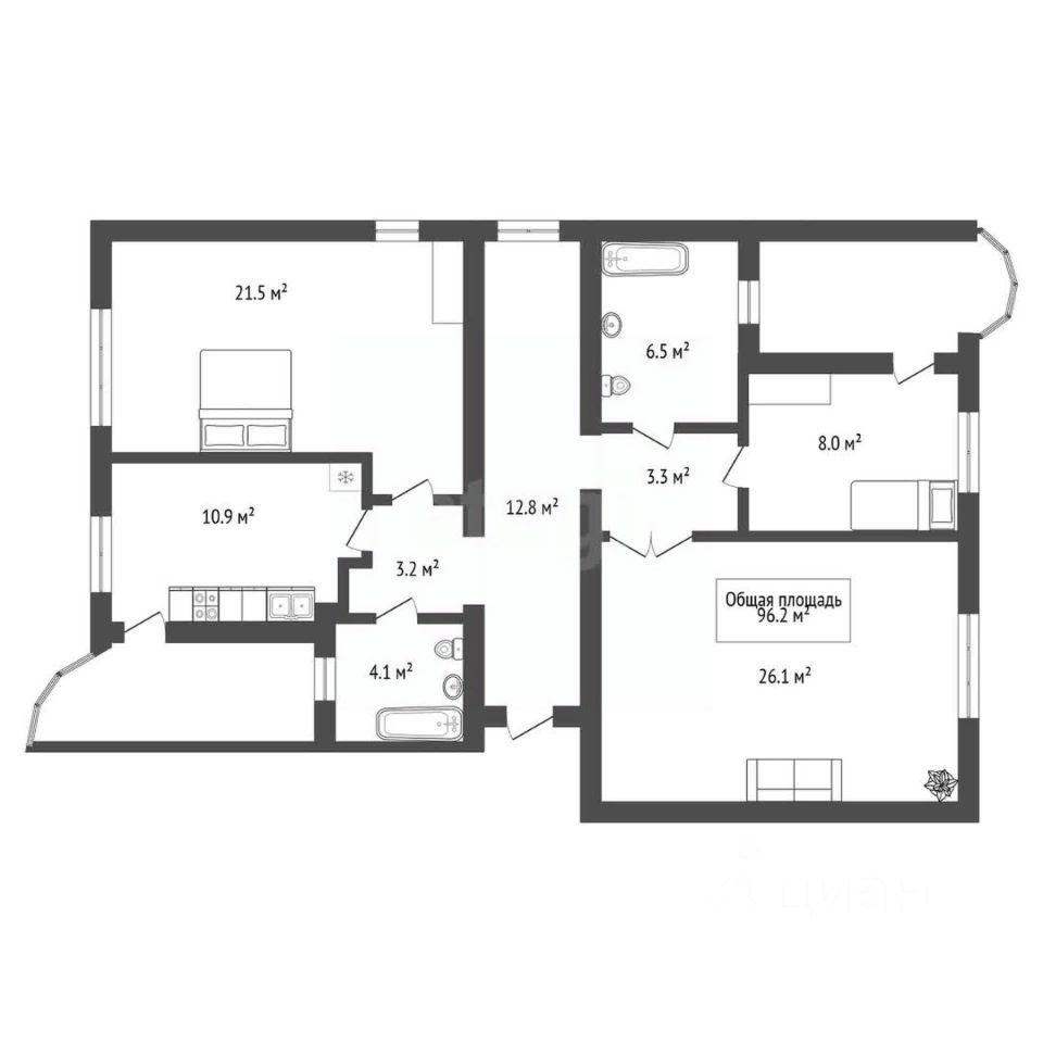 Общая площадь — 96,2 м² плюс лоджии 6,5 м². В квартире предусмотрены две мокрые точки: для кухни площадью 10,9 м² и 8 м², и две — для санузлов. Это дает редкий шанс сделать из нее два отдельных однокомнатных жилья или просторную трехкомнатную квартиру