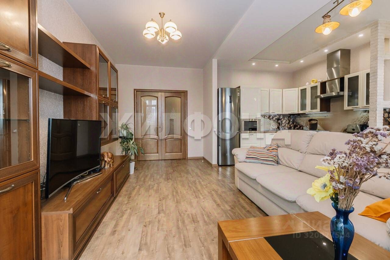 Удачная планировка, общая площадь 92 кв. м., из них кухня-гостиная 30 кв. м.с панорамными окнами, две спальни по 15 и 20 кв. м., балкон на два окна с видом на город, раздельный санузел, в прихожей оборудована гардеробная.